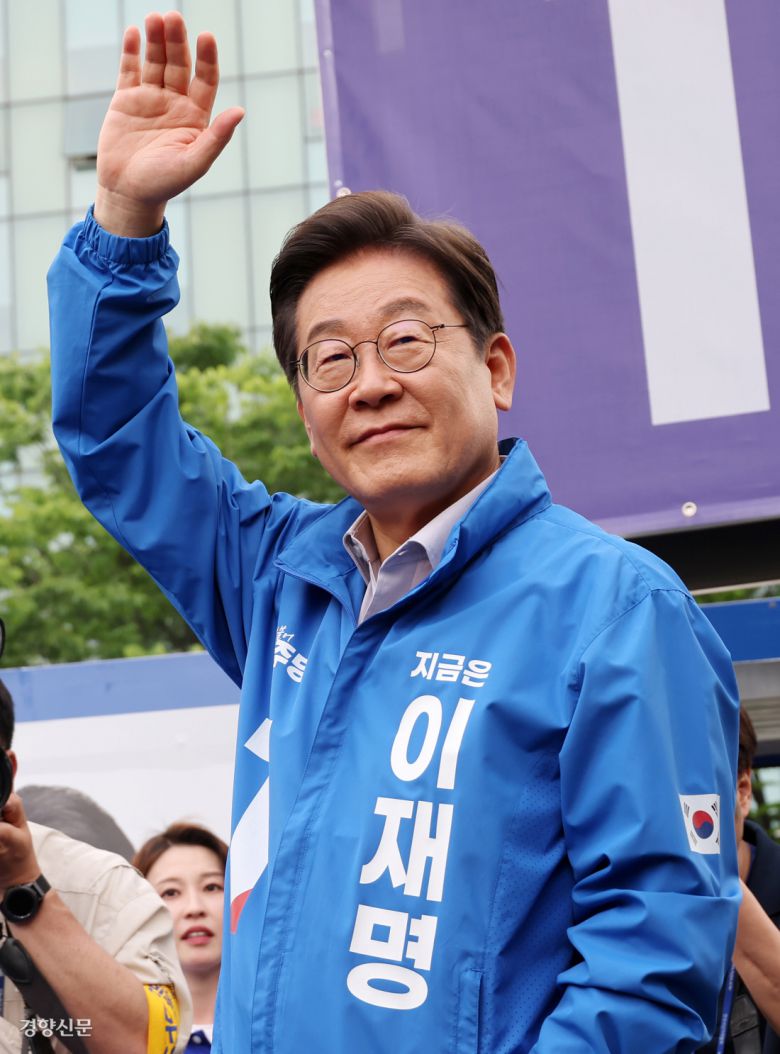 서울에서 이재명 더불어민주당 대선 후보가 28일 서울 광진구 어린이대공원 앞에서 열린 유세에서 시민들에게 손을 들어 인사하고 있다. 박민규 선임기자 parkyu@kyunghyang.com