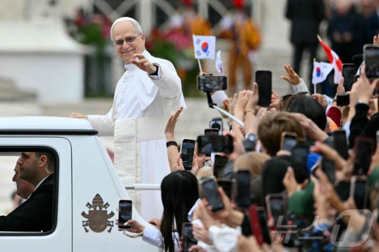 21일(현지시간) 바티칸 성 베드로 광장에서 열린 교황 레오 14세의 즉위 이후 첫 주간 일반 알현에 태극기가 보인다. 2025.05.21. ⓒ AFP=뉴스1 ⓒ News1 이지예 객원기자