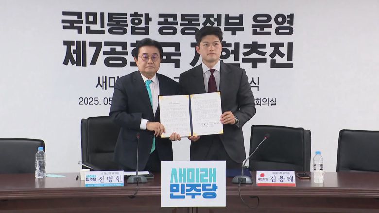 국민의힘 김용태 비상대책위원장과 새미래민주당 전병헌 대표는 새미래민주당 당사에서 이 같은 내용의 '공동정부 운영과 개헌 추진 합의 협약식'을 열었습니다.