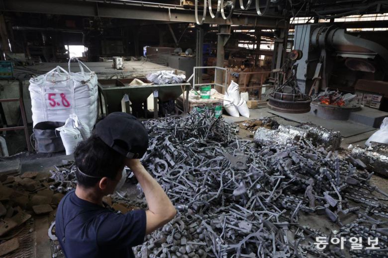 27일 오전 인천 서구의 자동차 부품 주물 업체인 부천주물 공장에서 한 직원이 가동 중지된 전기로를 바라보고 있다. 부천주물 측은 “전기료 절감 차원에서 전기로를 사용하지 않을 때나 점심시간에는 전기로가 꺼지지 않을 만큼의 최소 전력만으로 가동하고 있다”고 설명했다. 인천=박형기 기자 oneshot@donga.com |
