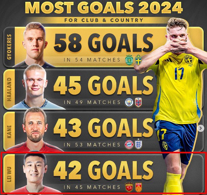 특히 지난해엔 총 42골을 소속팀인 상하이 포트와 중국 대표팀에서 터트려 빅토르 요케레스(58골·스포르팅 리스본), 엘링 홀란(45골·맨체스터 시티), 해리 케인(43골·바이에른 뮌헨)