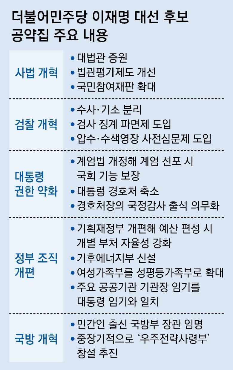 공약집에는 ‘대법관 증원’ 등 사법 개혁 과제를 비롯해 ‘기획재정부 개편’ ‘기후에너지부 신설’ 등 정부 조직 개편 방안이 명시됐다. 이 후보가 직접 밝혔던 ‘대통령 4년 연임제’와 ‘대통령 계엄 선포 및 재의요구권 요건 강화’ 등이 개헌 관련 공약으로 포함됐다. 이 후보는 해당 공약을 이행하는 데 5년간 210조 원 정도가 들 것으로 추산된다고 밝혔다.