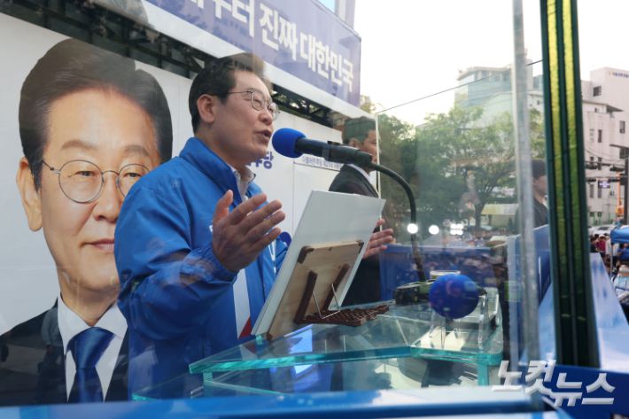 이재명 더불어민주당 대선 후보가 28일 오후 서울 성동구 왕십리역 광장에서 열린 유세에 참석해 유권자들에게 지지를 호소하고 있다. 류영주 기자