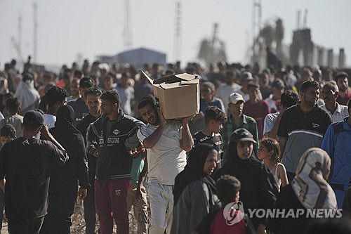 (이스탄불=연합뉴스) 김동호 특파원 = 이스라엘과 미국이 주도하는 가자인도주의재단(GHF)이 배급소 개소 이틀째인 28일(현지시간) 혼란 속에서도 구호품 배급을 이어갔다.