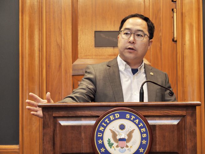 앤디 김 미국 연방 상원의원(민주당·뉴저지주)이 28일(현지시간) 워싱턴 D.C. 연방의회 건물에서 한국 언론들과 간담회를 갖고 있다./하만주 워싱턴 특파원 |
