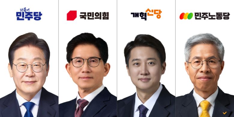 21대 대선 후보들. (왼쪽부터) 이재명 더불어민주당 후보. 김문수 국민의힘 후보. 이준석 개혁신당 후보. 권영국 민주노동당 후보. 한지영 디자이너