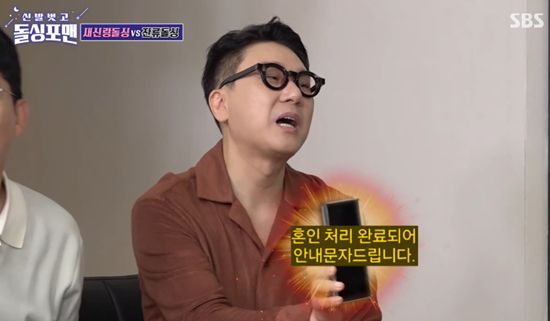 27일 방송된 SBS 예능 프로그램 '신발 벗고 돌싱포맨'에서 이상민은 "강남구청에서 연락이 왔다. 가족관계 등록 관련 신고 혼인신고가 처리 완료됐다고 안내 문자가 왔다"고 밝혔다.