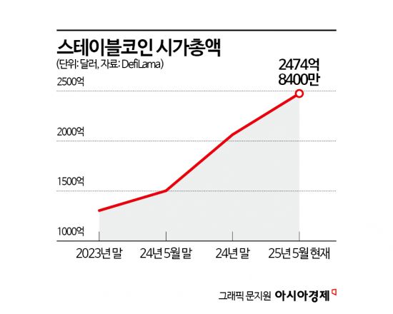 쓰임새가 많아지면서 스테이블코인 시장은 급속도로 커지고 있다. 디파이(탈중앙화 금융) 데이터분석기업 디파이라마(DefiLama)에 따르면 지난 27일 기준 스테이블코인 시가총액은 2474억8400만달러(약 340조원)에 이른다. 1년 전(약 1500억달러) 대비 64%가 증가했다. 우리 돈으로 환산하면 1년 사이 약 100조원이 늘었다.