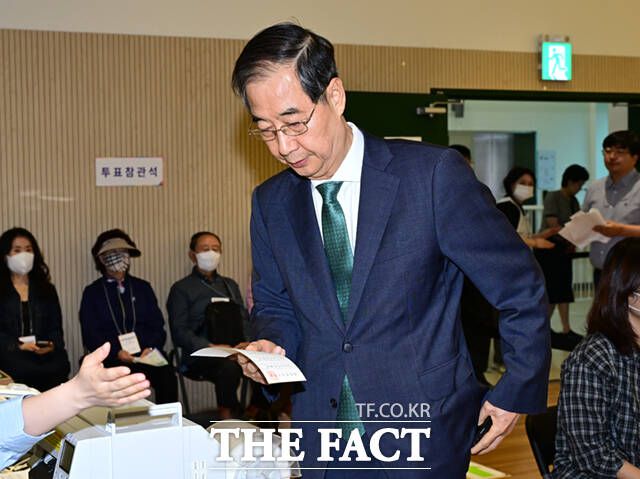 [더팩트ㅣ이새롬 기자] 한덕수 전 국무총리가 29일 오전 서울 종로구 사직동 주민센터를 찾아 제21대 대통령선거 사전투표를 하고 있다.