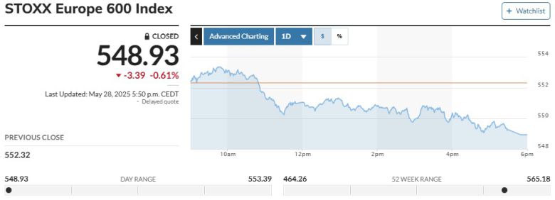 이날 범유럽 주가지수인 스톡스유럽600지수는 전 거래일 대비 3.39포인트(0.61%) 내린 548.93에 마감했다. 독일 프랑크푸르트증시 DAX30지수는 188.30포인트(0.78%) 하락한 2만4038.19에, 영국 런던증시 FTSE100지수는 52.04포인트(0.59%) 떨어진 8726.01에, 프랑스 파리증시 CAC40지수는 38.69포인트(0.49%) 낮아진 7788.10에 거래를 마쳤다.