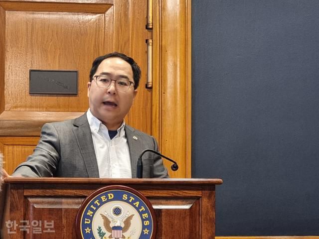 한국계인 앤디 김 미국 연방 상원의원이 28일 미 워싱턴 덕슨 상원의원 회관에서 한국 등 아시아·태평양 국가 언론을 대상으로 기자간담회를 하고 있다. 워싱턴=권경성 특파원 |