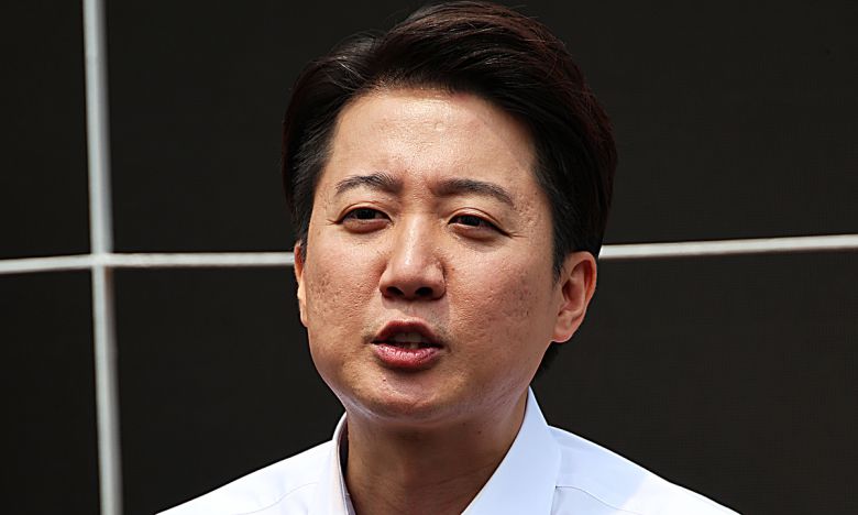 개혁신당 이준석 대선 후보가 사전투표를 하루 앞둔 28일 서울 여의도공원에서 유세를 마친 뒤 취재진의 질문에 답하고 있다. 연합뉴스