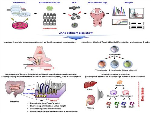 연구팀은 유전체 교정 기술인 '크리스퍼 카스9 유전자가위'(CRISPR-Cas9)를 활용, 미니돼지 최초로 JAK3 유전자를 결손 시킨 녹아웃(Knock-Out·제거) SCID 모델을 생산하는 데 성공했다.