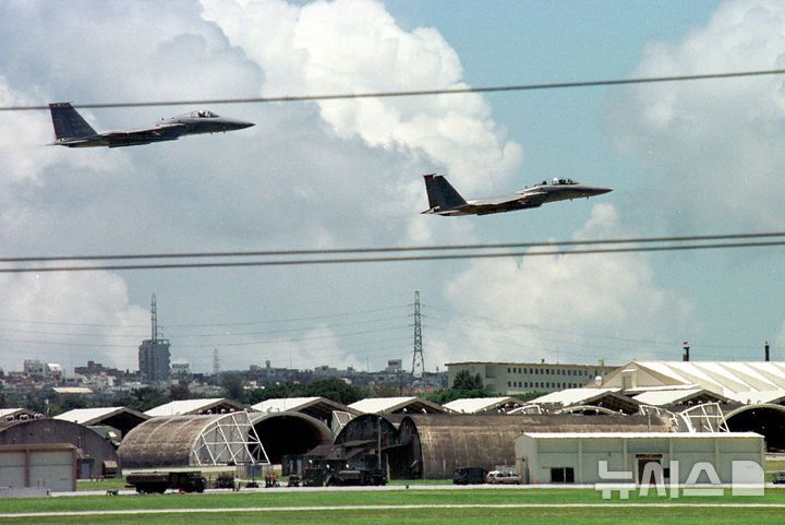 [오키나와=AP/뉴시스] 도널드 트럼프 미국 행정부가 이달 초 일본 정부에 주일미군 주둔 경비 분담금 증액을 요구했다고 아사히신문이 복수의 정부 관계자를 인용해 29일 보도했다. 사진은 주일미군의 F-15전투기가 일본 오키나와섬 가데나 공군 기지에서 비행 훈련을 하는 동안 착륙을 준비하는 모습. 2025.05.29. |