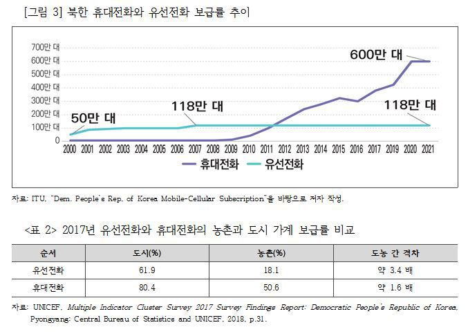 29일 한국개발연구원(KDI)이 발간한 북한경제리뷰 5월호에 수록된 '북한 휴대전화 연구:취약계층의 소득 증대를 중심으로' 보고서에 따르면 북한은 1인당 국민소득이 약 1300달러로 최빈곤국 수준이지만 휴대전화 보급률은 지속해서 증가하고 있다. 북한에서의 휴대전화 보급은 2009년 이후 본격적으로 시작돼 2021년 기준 600만 대에 이른다. 북한 인구가 약 2500만 명인 점을 고려하면 휴대전화의 보급률은 약 23~24%에 불과하다. 북한 주민 10명당 2명만 휴대전화를 가지고 있는 셈이다.
