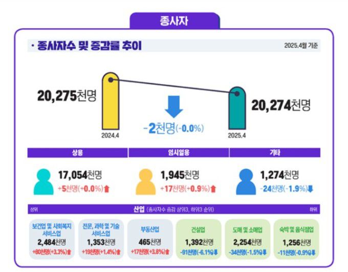 ◆ 4월 종사자 수 2027만4000명…건설업서 9만1000명 감소