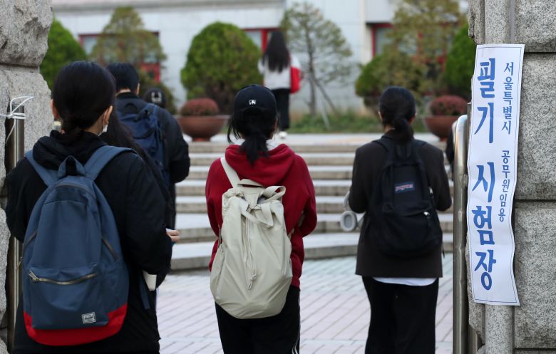 서울 한 학교에 마련된 공무원 지방직 필기시험장으로 응시생들이 들어가고 있다. /뉴스1