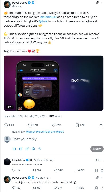 그록 탑재 사실을 알리는 파벨 두로프 텔레그램 최고경영자(CEO)의 X. 일론 머스크가 댓글로 “아직 거래가 체결되지 않았다”는 댓글을 달았다. |