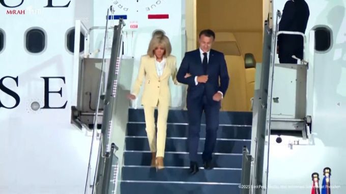 28일(현지시간) AP통신은 마크롱 대통령이 27일 동남아시아 순방 두 번째 일정지인 인도네시아에 도착해 브리지트 마크롱(72) 여사와 같이 비행기에서 내리는 영상을 공개했다.