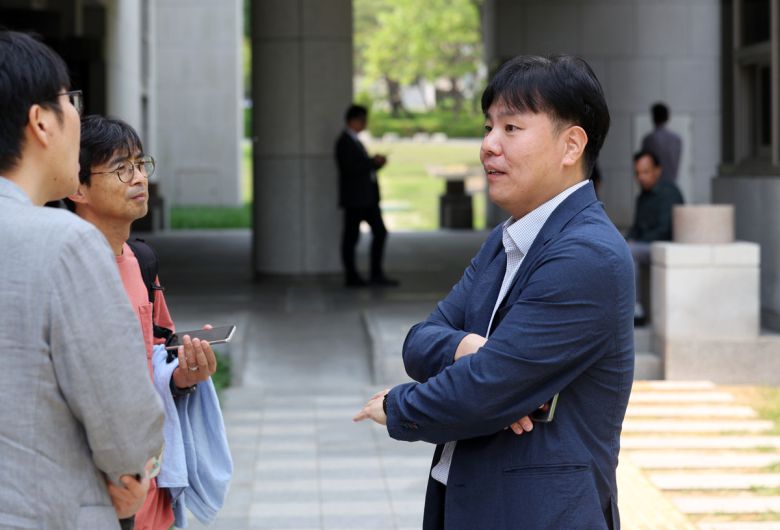 박정희 정부 시절 이른바 '통일혁명당(통혁당) 재건위 사건'에 연루돼 중형을 선고받은 고 진두현 씨와 고 박석주 씨의 재심 선고기일인 29일 서울 서초구 대법원에서 상고심 선고를 마친 고 박석주 씨 아들 박정민(오른쪽) 씨가 취재진과 인터뷰하고 있다. 대법원 3부는 진 씨와 박 씨의 국가보안법 위반 등 혐의 재심 사건 선고기일에서 검사의 상고를 기각하고, 무죄를 선고한 재심 판결을 확정했다.    뉴시스