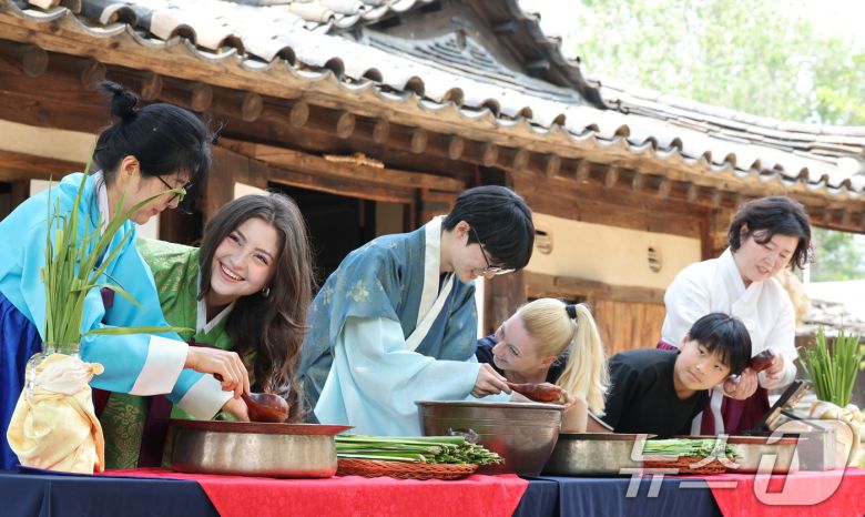 (서울=뉴스1) 신웅수 기자 = 단오(음력 5월5일)를 이틀 앞둔 29일 서울 종로구 국립민속박물관에서 관광객들이 창포물에 머리 감기 체험을 하고 있다. 옛사람들은 날이 더워지는 단오에는 창포물에 머리를 감아 나쁜 기운을 물리치고 건강한 머리카락을 유지하는 풍습을 행했다. 2025.5.29/뉴스1