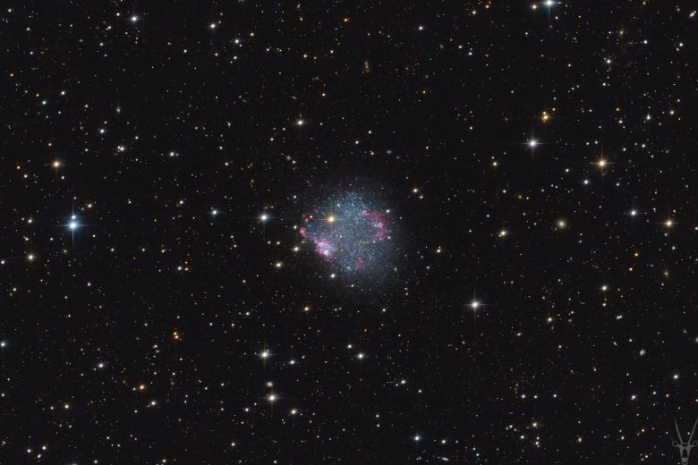 화려한 대형 나선 은하처럼 작은 은하들도 별을 만든다. 사진 속의 왜소불규칙은하 ‘육분의 A’에서도 밝고 푸른 젊은 별 무리와 별이 새로 태어나는 분홍빛 구역들을 볼 수 있다. 왜소불규칙은하는 나선 은하, 타원 은하와 달리 뚜렷한 형태를 갖지 않으면서 질량이 작은 은하다. 사진에서 보이는 밝고 노란색을 띠는 별들은 우리은하에 있는 별들이다.