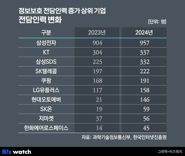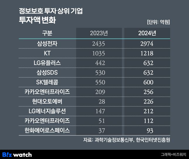 하지만 기업들의 정보보호 투자는 여전히 소극적이다. 과학기술정보통신부와 한국인터넷진흥원에 따르면 분석대상 기업 732곳의 평균 정보보호 투자액은 2023년 26억원에서 지난해 29억원으로 소폭 올랐고, 평균 정보보호 전담인력은 같은기간 9.6명에서 10.5명으로 늘어나는데 그쳤다.