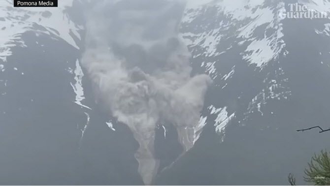 28일(현지시간) 스위스 알프스 남부 발레주 블라텐 마을 인근에서 빙하가 무너지며 산사태를 일으키고 있다. (사진=가디언 동영상 캡처) |