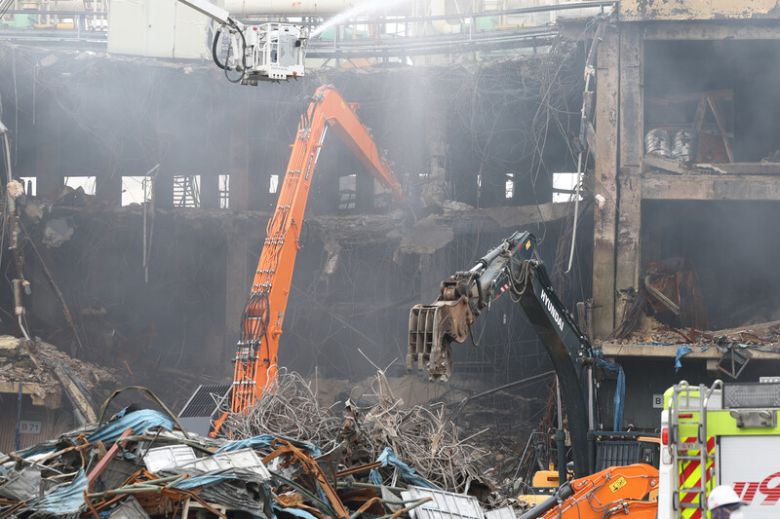 22일 오전 광주 광산구 금호타이어 광주공장에서 소방대원들이 중장비를 이용해 불이 난 건물을 해체하고 있다. 연합뉴스 |