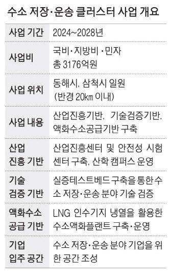이 가운데 핵심 사업은 '수소 저장·운송 클러스터'다. 동해와 삼척에 걸쳐 조성되는 클러스터는 작년에 행정 절차를 마무리하고 연내 착공을 목표로 하고 있다. 2028년까지 총 3177억원을 투입해 동해~삼척 간 수소 저장·운송 산업 기반을 구축하는 것이 주요 골자다.