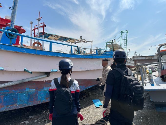 해양오염 시킨 레저보트에 대한 수사를 하고 있는 평택해경 관계자[사진=평택해경] |