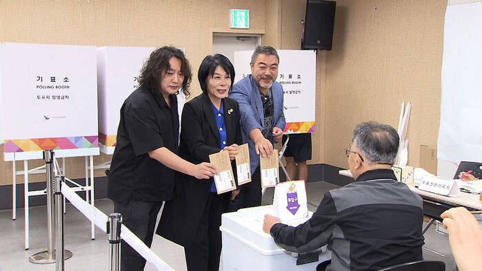 민주당 최민희 의원이 본부장을 맡고 있는 민주당 중앙선대위 국민참여본부가 이재명 후보 지지를 선언한 배우 등 유명 인사들과 사전투표에 참여했습니다.