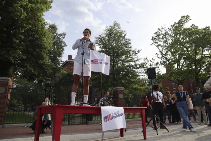 [케임브리지=AP/뉴시스] 27일(현지 시간) 미 매사추세츠주 케임브리지의 하버드대학교 사이언스센터 광장에서 2026년 졸업 예정자인 누리엘 베라-디그레프가 도널드 트럼프 대통령의 최근 하버드 제재에 반대하며 발언하고 있다. 2025.05.28 |