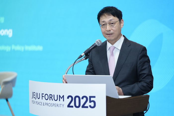 윤지웅 과학기술정책연구원장이 2025 제주포럼에 앞서 개회사를 하고 있다.
