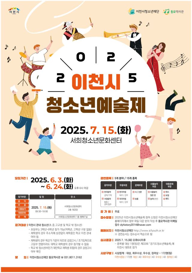 경기 이천시는 지역 청소년의 예술 재능과 실력을 펼칠 2025년 청소년종합예술제를 오는 7월 15일 서희청소년문화센터 대강당에서 개최한다.