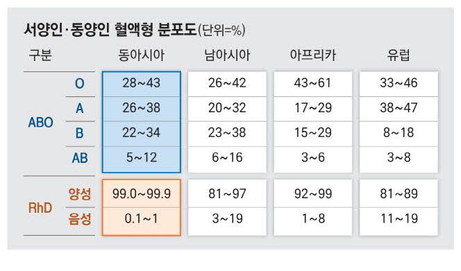연구팀에 따르면 한국, 일본, 중국, 대만 등 동아시아는 유럽, 중동, 아프리카 지역과 달리 AB형의 비율이 상대적으로 높은 반면 RhD 음성은 극히 낮은 것으로 나타났다. 구체적으로는 동아시아에서 AB형의 분포는 5~12%, RhD 음성 분포는 0.1~1%로 나왔고, 유럽에서는 각각 3~8%, 11~19%로 집계됐다. 혈액형 분포에서 지역적·인종적 차이가 뚜렷하게 드러난 것이다.
