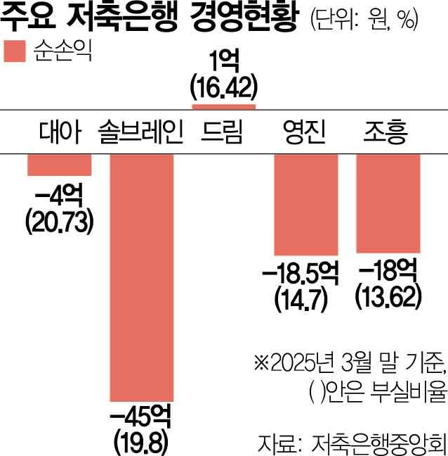 건전성은 나빠지고 있다. 저축은행의 1분기 연체율은 9%로 지난해 말(8.52%)보다 0.48%포인트 뛰었다. 기업대출 연체율은 13.65%, 가계대출 연체율은 4.72%로 지난해 말보다 각각 0.84%포인트, 0.19%포인트 상승했다. 부실 대출 비율은 10.59%로 지난해 말(10.66%)보다 0.07%포인트 줄었다. 이날 개별공시를 하지 않은 저축은행들은 30일 경영실적을 내놓는다. 저축은행중앙회의 한 관계자는 “부실채권 감축을 위한 매각·상각 등 적극적인 자구 노력에도 불구하고 연체여신 증가와 여신 규모 감소에 따른 모수 효과로 연체율이 전년 말 대비 증가했다”며 “올 상반기까지 정상화펀드, 공동매각 등을 통해 1조 원 이상 부실채권을 매각할 계획”이라고 밝혔다.