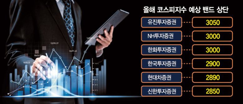 29일 금융투자업계에 따르면 주요 증권사들은 올해 하반기 코스피 예상 상단을 3000선 안팎으로 제시했다. 가장 높은 상단을 제시한 건 유진투자증권이다. 유진투자증권은 하반기 코스피 예상 밴드를 2550~3050선으로 제시했다. 이어 한화투자증권과 NH투자증권이 각각 코스피 상단을 3000선으로 예상했으며, 이외에도 한국투자증권은 2400~2900선, 신한투자증권 2400~2850, 현대차증권은 2360~2890선을 각각 제시했다.