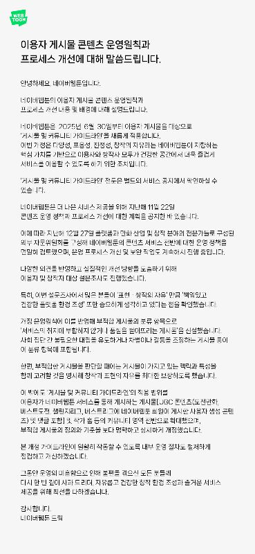 네이버웹툰은 공지사항을 통해 "이번 개정은 다양성과 포용성, 진정성, 창작의 자유라는 네이버웹툰이 지향하는 핵심 가치를 기반으로 이용자와 창작자 모두가 건강한 공간에서 더욱 즐겁게 서비스를 이용할 수 있도록 하기 위한 조치"라며 "그동안 운영의 미흡함으로 인해 불편을 겪으신 모든 분들께 다시 한 번 깊이 사과 드린다"고 밝혔다.