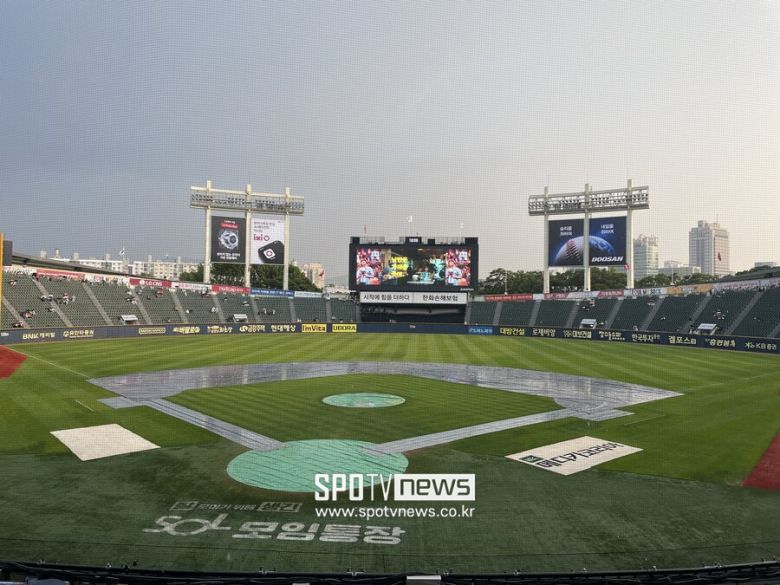 LG 구단관계자는 29일 오후 "경기는 오후 7시 지연 개시된다"고 설명했다. 경기 개시를 얼마 남기지 않은 5시 50분쯤부터 비가 쏟아졌다. 비는 30분 가량 내리면서 그라운드를 적셨다. 방수포가 설치됐지만 내야 일부 지역에 물이 고인 흔적이 남았다. 비가 그친 뒤 곧바로 그라운드 정비가 시작됐지만 지연 개시가 불가피한 상태다.