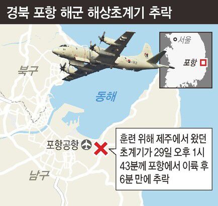 29일 오후 1시43분쯤 해군 포항기지를 이륙한 해상초계기(P-3CK) 1대가 이륙 6분 만인 오후 1시49분쯤 기지 인근에 추락했다. 추락 원인은 아직 밝혀지지 않았다. 초계기는 경북 포항시 남구 포항공항 인근 야산에 추락했고, 타고 있던 승무원 4명은 이날 오후 모두 주검으로 발견됐다. 추락과 함께 일어난 불은 출동한 소방당국에 의해 진화됐다. 경찰과 소방당국은 정확한 피해 상황과 민간인 피해 여부를 파악 중이다.