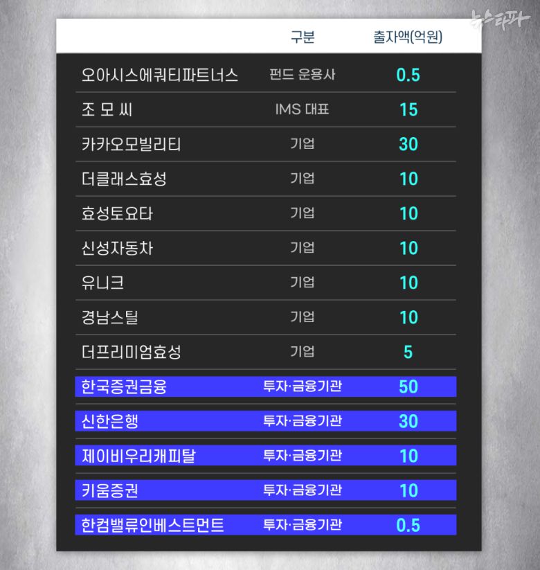 뉴스타파는 한국증권금융(50억 원) 외에도 신한은행이 30억 원, 키움증권이 10억 원을 투자한 사실도 확인했습니다. 공교롭게도 투자 당시 신한은행은 사모펀드 불완전 판매 등과 관련해 금융당국의 조사를 받고 있었고, 키움 증권은 SG 증권발 주가 폭락 사태의 여파로 심각한 오너리스크가 발생한 상황이었습니다. 그밖에도 제이비우리캐피탈(10억 원), 자동차 부품회사인 유니크(10억), 홍준표 테마 종목으로 유명한 철강회사 경남스틸(10억 원) 한컴밸류인베스트먼트(5천만원) 등이 투자에 참여했습니다.