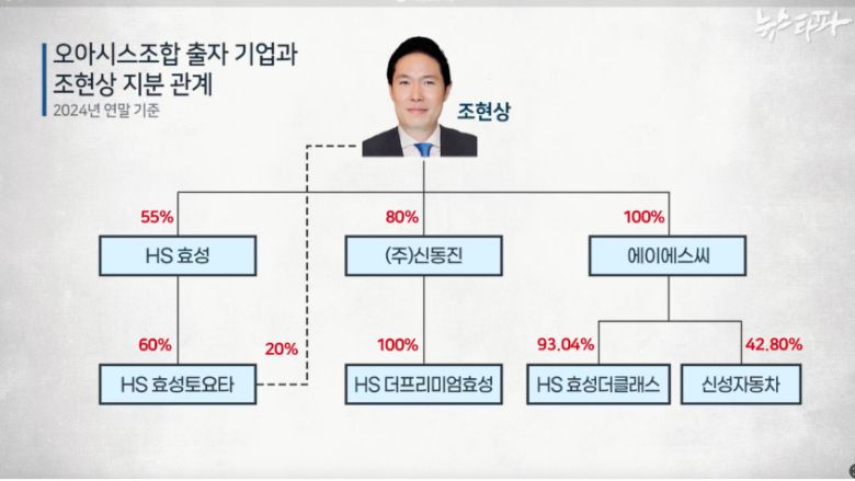 김건희 측근이 지분을 갖고 있던 벤처기업 IMS에 투자한 회사 중에는 HS효성의 계열사가 4곳이나 됩니다. 더클래스효성이 10억 원, 더프리미엄효성이 5억 원, 신성자동차가 10억 원, 효성도요타가 10억 원을 투자했습니다. 이 중 더클래스효성과 신성자동차는 조현상 씨 개인 회사인 에이에스씨가 지배하고 있고, 더프리미엄효성은 신동진이라는 회사의 지배를 받고 있는데 신동진 역시 조현상 씨 지분이 80%입니다. 효성도요타는 HS효성의 자회사인데, HS효성의 지배주주 역시 조현상입니다. 한 마디로 정리하면, IMS에 투자를 한 모든 효성 계열사의 꼭대기에 단 한 사람, 조현상 씨가 있다는 얘기입니다.