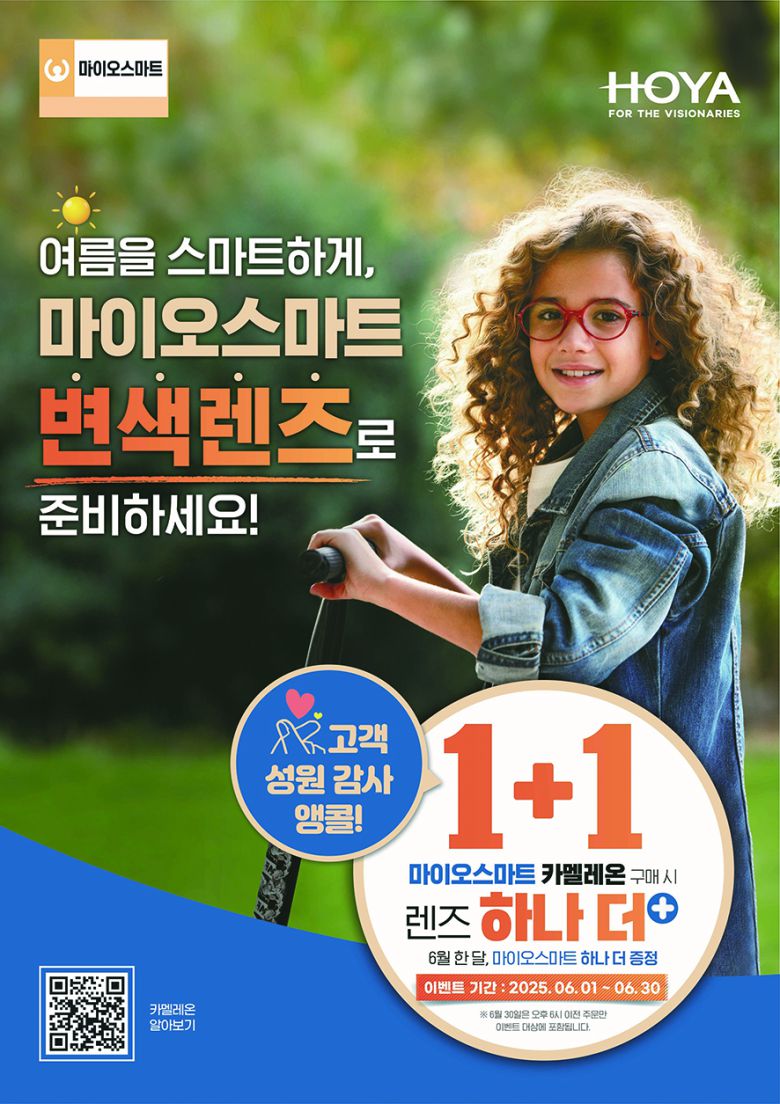 이번 이벤트는 6월1일부터 30일까지 전국 마이오스마트 취급 안경원에서 진행되며 포스터 내 QR코드를 통해 자세한 내용을 확인할 수 있다.