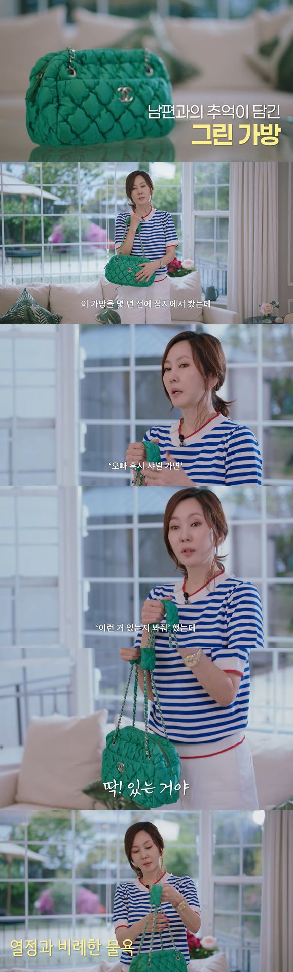 이어 샤넬 가방을 소개하며 남편 김승우와 얽힌 에피소드도 공개했다. "몇 년 전에 잡지에서 봐서 너무 예쁘다고 생각했다. 마침 남편이 외국에 있어서 샤넬 가면 '이 가방이 있는지 봐줘'라고 했는데 딱 있더라"며 "신혼 초라 저도 젊었으니까 물욕이 있었나 보다. 사다줬는데 너무 좋더라"고 회상했다.
