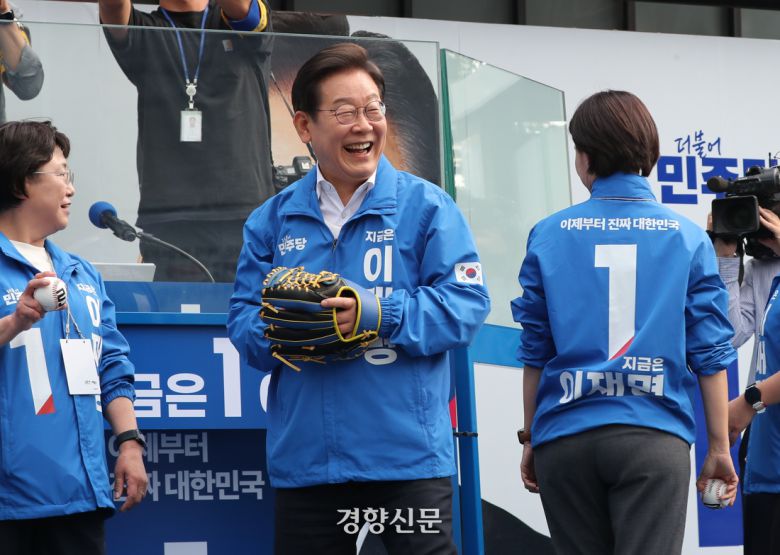 더불어민주당 이재명 대선 후보가 29일 오후 서울 송파구 잠실종합운동장역 앞 유세장에서 기표 기호가 그려진 야구공을 던지는 퍼포먼스를 하고 있다. 박민규 선임기자 |
