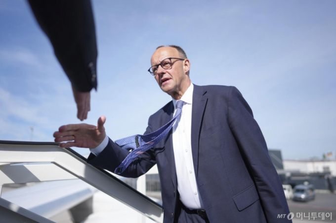 [베를린=AP/뉴시스]프리드리히 메르츠 신임 독일 총리가 7일 프랑스와 폴란드 순방에 나서면서 독일 베를린에서 독일 공군 항공기에 탑승하고 있다.  2025.05.07.