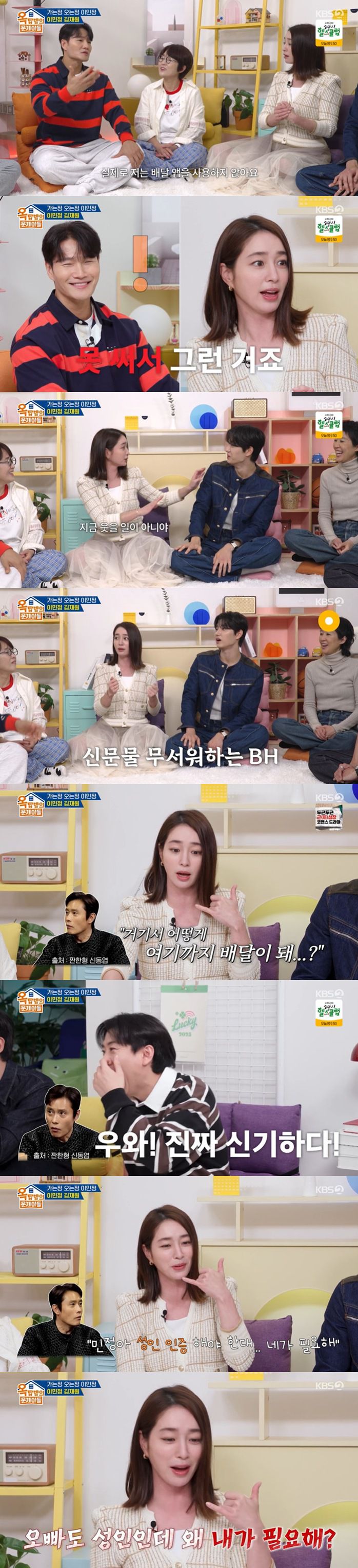 김재원이 몸을 기울이며 웃자, 이민정은 "지금 웃을 일이 아니다. 진짜 못 써서 그런 거다"고 단호하게 말하며 상황의 진지함(?)을 강조했다. 이어 김숙이 "옆에서 다 해주시는 거냐"고 묻자 이민정은 "처음으로 배달 어플을 깔아줬는데 한 번도 안 쓰더라. 이걸 되게 무서워하는 것 같다"고 말했다.