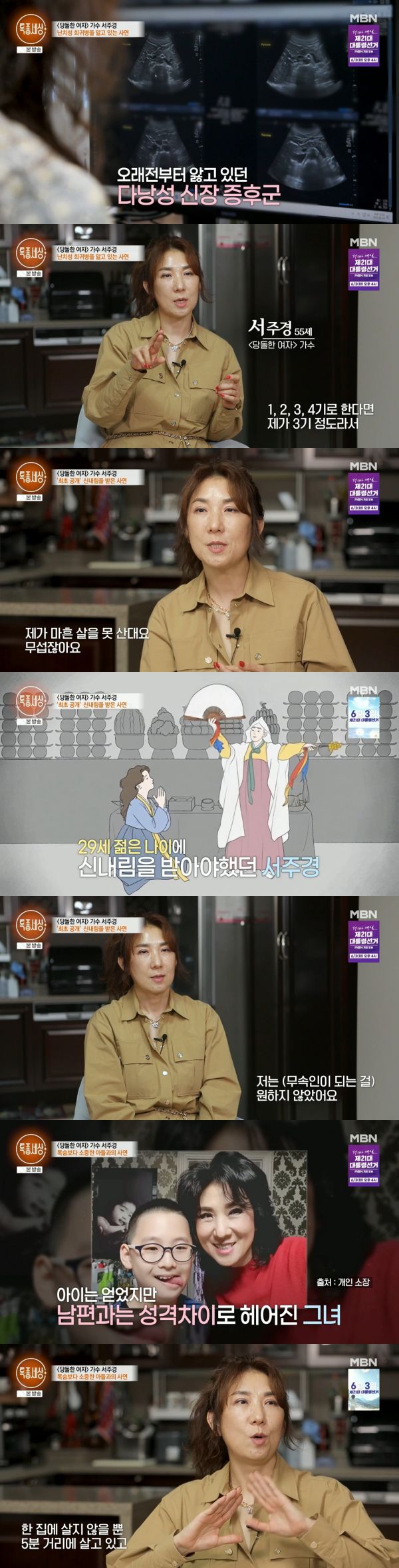 [스포츠투데이 김태형 기자] 가수 서주경이 29세 나이에 신내림을 받았다고 고백했다. 또한 다낭성 신장 증후군이라는 희귀병을 30년 가까이 앓고 있다고 밝혔다.