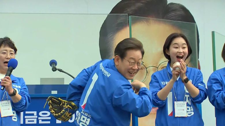 4개 야당 대표들과 나란히 선 민주당 이재명 후보가 야구공을 던지며, '내란'을 '스트라이크 아웃'시키겠다고 다짐합니다.